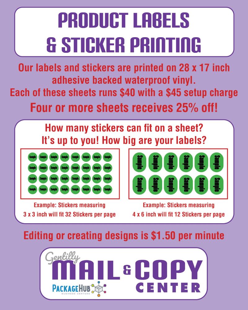 Gentilly Mail & Copy Center offers the highest quality of custom sticker and custom label printing at the lowest prices in the New Orleans, LA area and we stand behind our experience and attention to detail.
